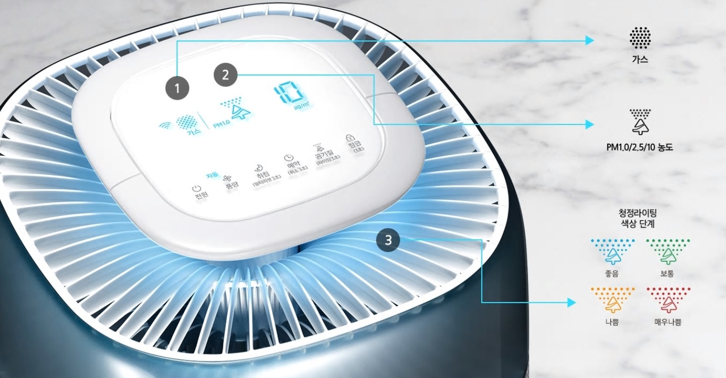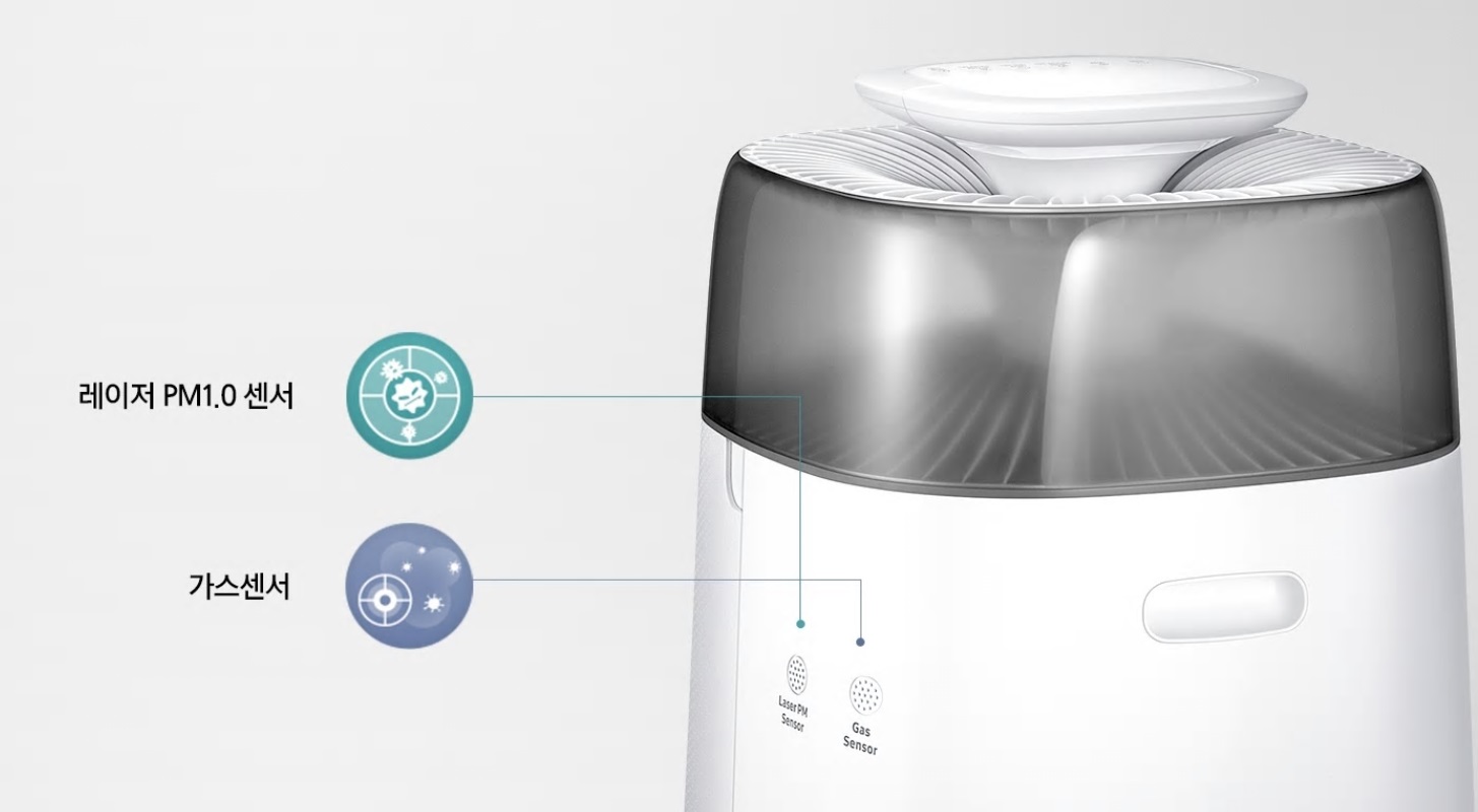 숯 탈취필터 제거 성능은 4 ㎥ 크기 챔버 시험 결과에 근거함. 탈취 효율 평가 방법, 한국공기청정협회 유해가스제거시험 참조 진행 (SPS KACA002 132, 시험시간 : 1시간), 레이저 PM1.0 센서로 미세한 입자까지 정밀하게 감지, 레이저 광원으로 아주 미세한 입자(0.3 ㎛)까지 감지하고, 다양한 크기의 미세먼지(PM10, PM2.5, PM1.0) 농도를 알려줍니다. 또한, 가스센서를 통해 유해가스 오염도를 정밀하게 감지합니다.