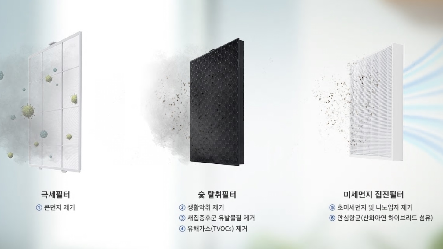 99.9 필터시스템으로 빈틈없는 먼지제거, 초미세먼지 기준(2.5 ㎛)보다 작은 0.3 ㎛ 사이즈 먼지까지 99.9 % 제거¹ 하는 미세먼지 집진필터가 장착되었으며,각종 생활악취와 유해가스를 제거² 하는 6중의 청정 시스템입니다.