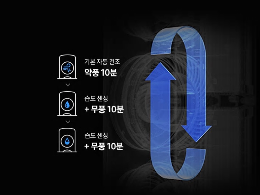 에어컨 내부 관리도 쾌적하게 3단계 자동청소건조, 사용 후 10분 자동건조가 시작되고, 습도센서를 통해 물기가 남아있으면 추가 10분씩 무풍 건조를 진행하여 청결한 관리가 가능합니다.