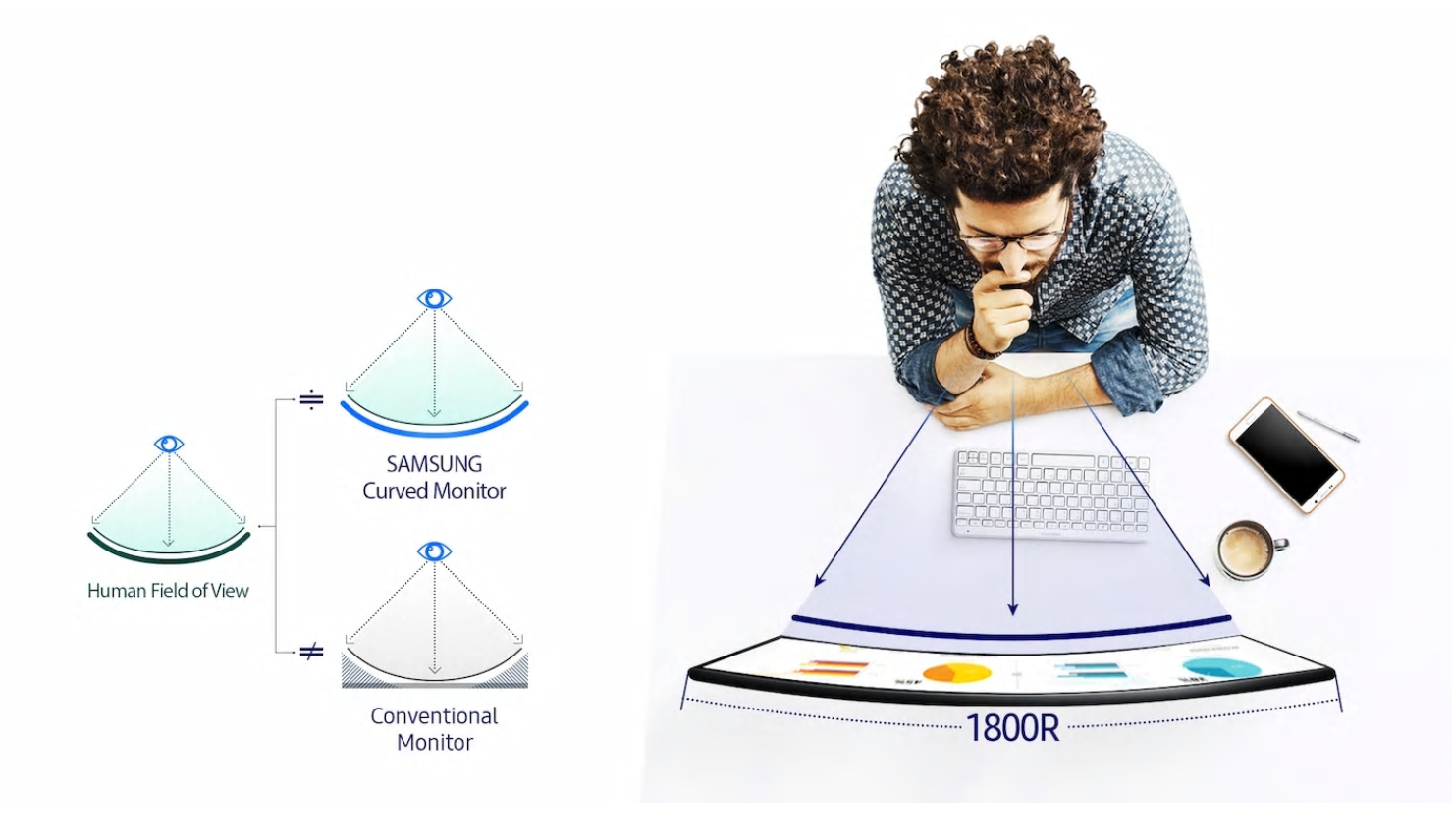 우리 눈에 꼭 맞춘 1800R 곡률, 모니터와 눈 사이의 거리를 고려해 만든 1800R 곡률, 타사의 커브드 모니터 보다 깊어진 곡률감으로 우리 눈에 꼭 맞게 설계해 편안하고 실감나게 영상을 보실 수 있습니다.