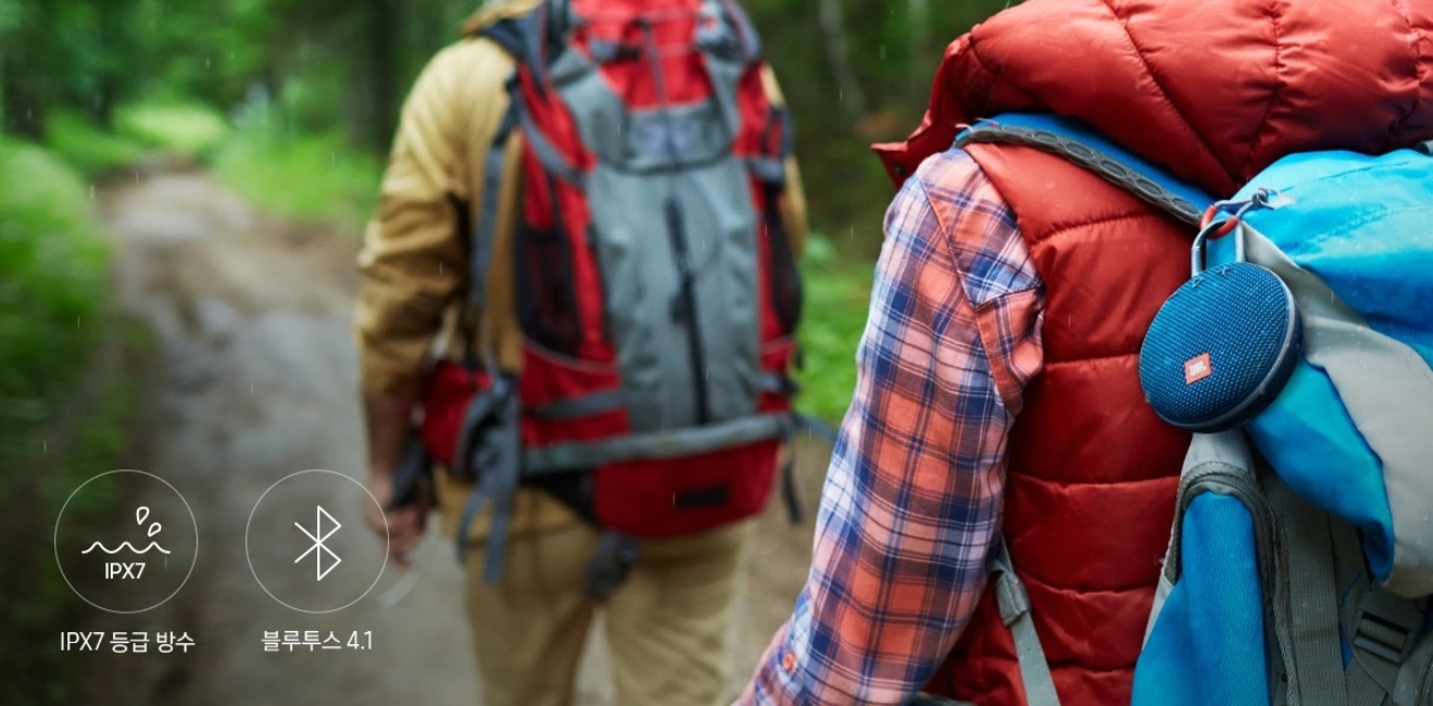 비가 와도 걱정없는 방수 기능 장소, 날씨와 관계없이 음악을 즐기세요. 등산 중 갑작스러운 소나기에도, 물놀이 중 물이 튀어도 IPX7 등급의 방수로 문제없습니다.