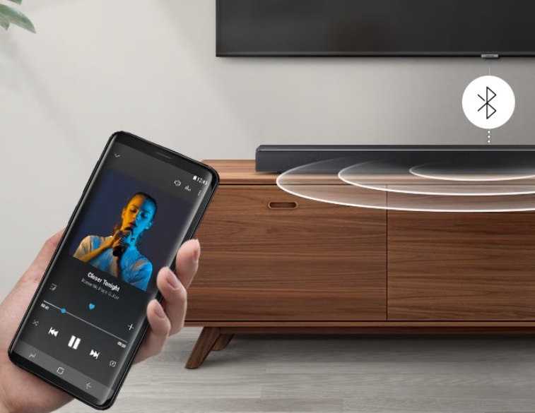 블루투스로 편리한 음악 스트리밍 사운드바와 다양한 기기를 블루투스로 손쉽게 연결하세요. 복잡한 선 연결 없이 깔끔하고 편리합니다. 스마트폰에 담긴 플레이 리스트를 사운드바의 생생한 음질로 즐기세요.