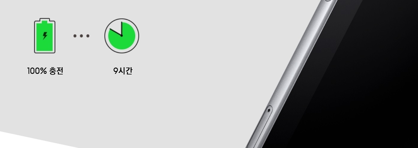 휴대는 간편하게, 충전은 빠르게 고속 충전 대폰 충전기 같은 가벼운 충전기로 간편하게 들고 다니면서 충전하세요. 그리고 충전속도까지 빠르고 100 % 충전 시 최대 9시간까지 사용할 수 있으므로 밖에서도 배터리 걱정 없이 즐기실 수 있습니다.