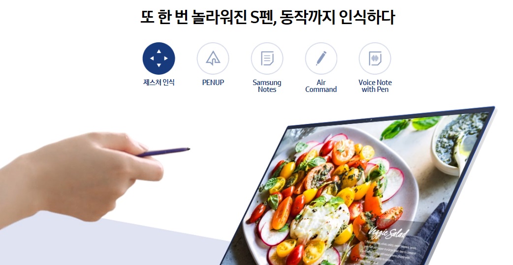 새로워진 S펜은 간단한 제스처만으로 다양한 일들을 척척 해냅니다. 클릭과 손짓 한 번으로 동영상을 재생하고, 파워포인트 슬라이드를 넘기고, 심지어 볼륨 조절도 가능하죠.