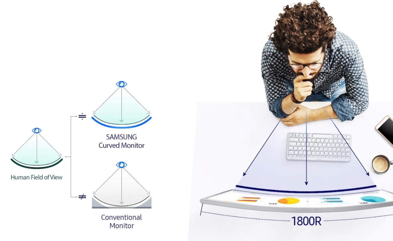 우리 눈에 꼭 맞춘 1800R 곡률 모니터와 눈 사이의 거리를 고려해 만든 1800R 곡률, 타사의 커브드 모니터 보다 깊어진 곡률감으로 우리 눈에 꼭 맞게 설계해 편안하고 실감나게 영상을 보실 수 있습니다.