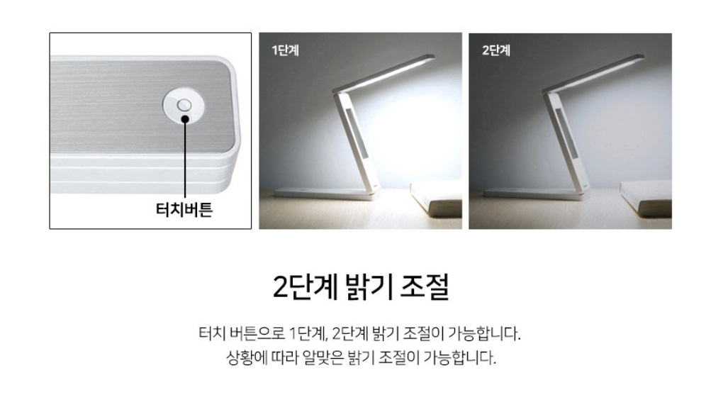 소이믹스 스마트 폴딩 접이식 LED는 2단계 밝기 조절은 직관적이며, 매우 심플하게 사용할 수 있습니다. 터치버튼으로 1단계, 2단계 밝기 조절이 가능합니다. 상황에 따라 알맞은 밝기 조절이 가능합니다. 공부 할때. 독서할때, 학습력향상에 도움이 됩니다. 환한 LED 라이트로 시력도 보호하고, 집중되는 환경을 만들 수 있습니다.