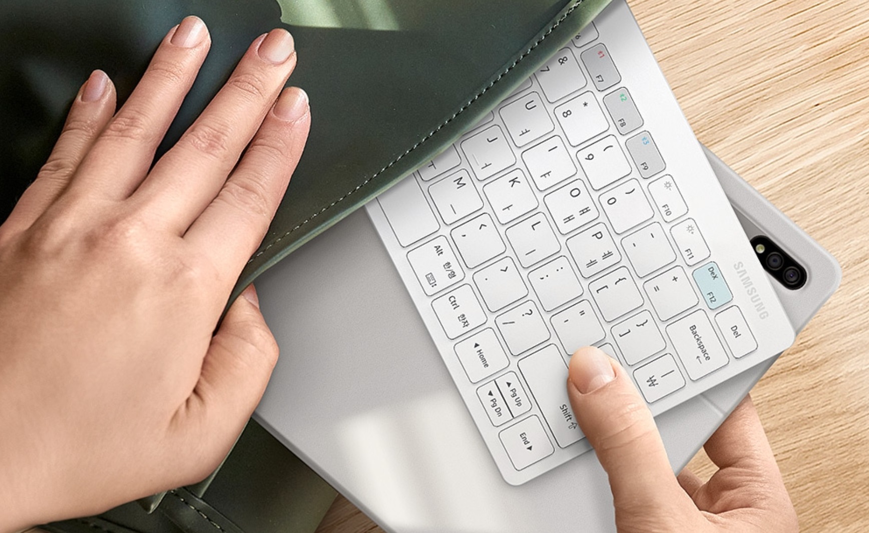 스마트 키보드 트리오 500은 작업 효율을 높이는 삼성 덱스, 삼성 스마트 키보드 트리오 500은 삼성 덱스와 함께할 때 더욱 빛이 납니다. 그리고 갤럭시 스마트폰을 연결해 어디서든 PC처럼 문서 작업을 하고, 이메일을 보내고, 화상 미팅도 할 수 있죠.