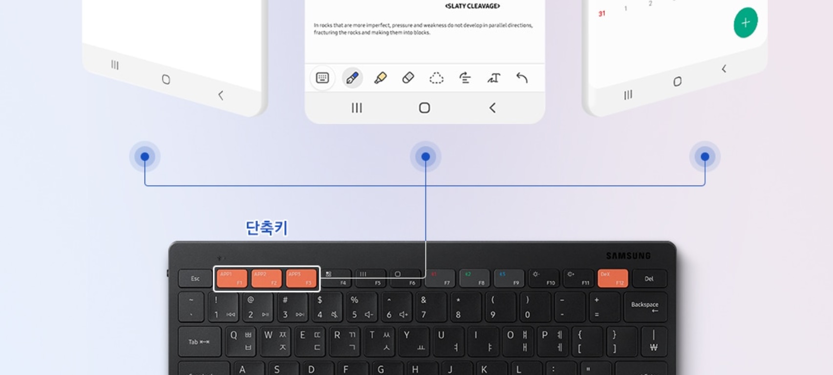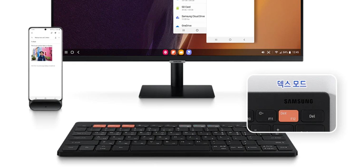 작업 효율을 높이는 삼성 덱스, 삼성 스마트 키보드 트리오 500은 삼성 덱스와 함께할 때 더욱 빛이 납니다. 그리고 갤럭시 스마트폰을 연결해 어디서든 PC처럼 문서 작업을 하고, 이메일을 보내고, 화상 미팅도 할 수 있죠.