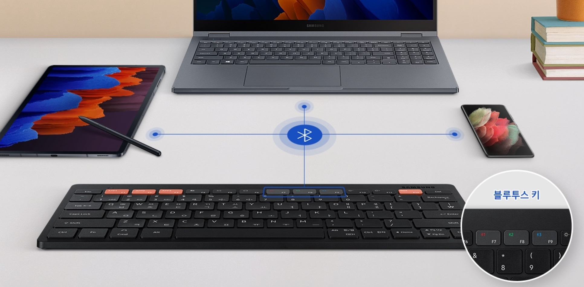 스마트 키보드 트리오 500는 다양한 기기를 자유롭게 넘나드는 키보드 최대 3대의 기기까지 동시에 연결됩니다. 3개의 블루투스 키를 누르기만 하면 손쉽게 각 키에 연결된 기기로 넘나들 수 있죠. 노트북, 태블릿, 스마트폰을 동시에 연결해 필요한 기기로 바로바로 전환하세요.