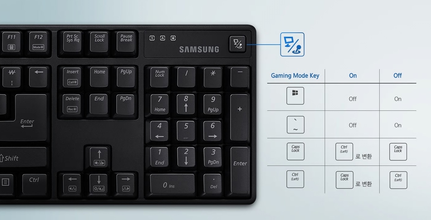게임에 최적화된 Gaming Mode Key,게임 시 불필요한 키의 기능을 On/Off 하고 자주 사용하는 키의 위치를 변환하여 사용자의 손가락 피로도를 줄여 줍니다.Customizing 가능한 Key Mask Mode,게임 플레이할 때 원하는 키의 LED만 켜지도록 지정할 수 있어서 정확하게 키인할 수 있습니다.