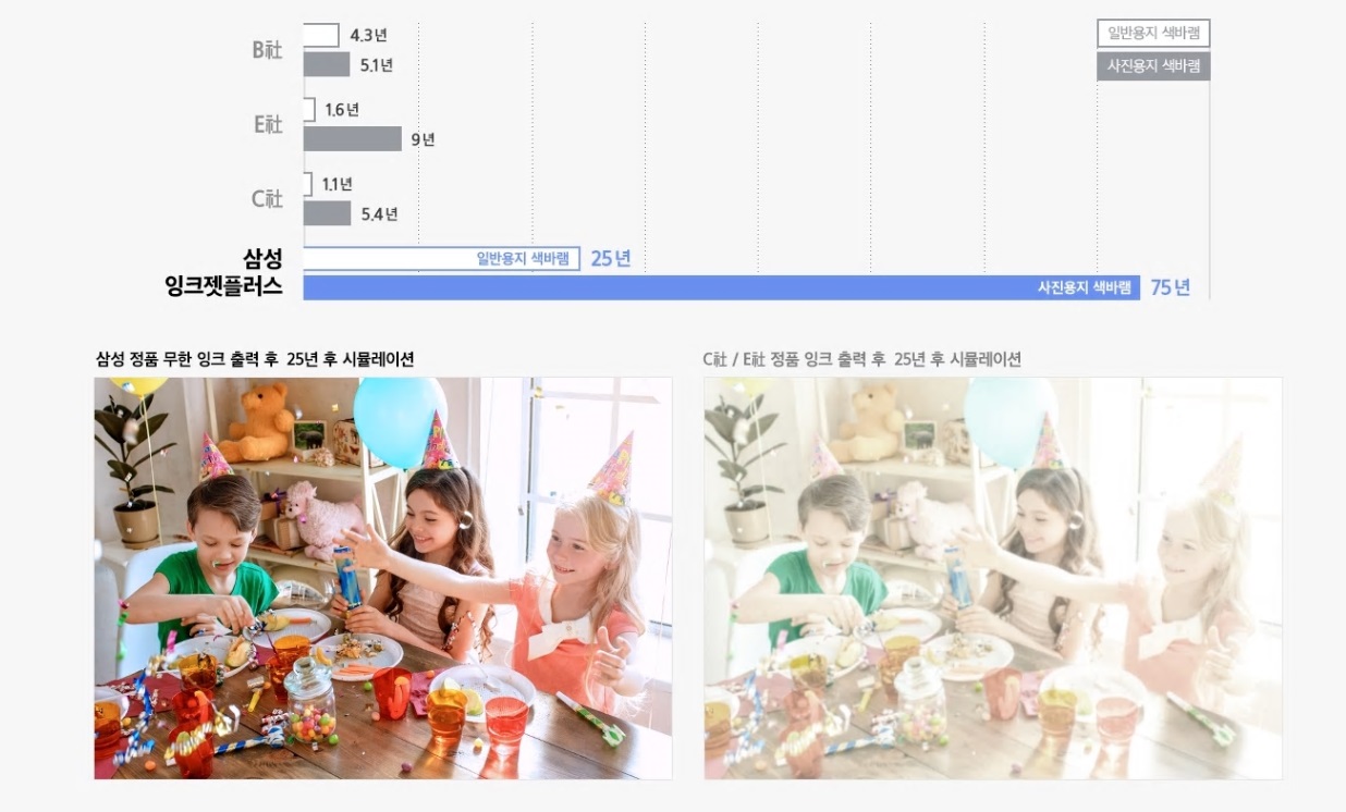 잉크젯 플러스는 타사 대비 인쇄 후 색바램이 최대 22배 늦게 나타나 오랫동안 색상을 보존해 줍니다. 최대 75년간 잘 변하지 않는 색상으로 가족사진도 출력해서 평생 깨끗하게 보세요. 일반용지 25년, 사진용지 75년 유지해 줍니다.