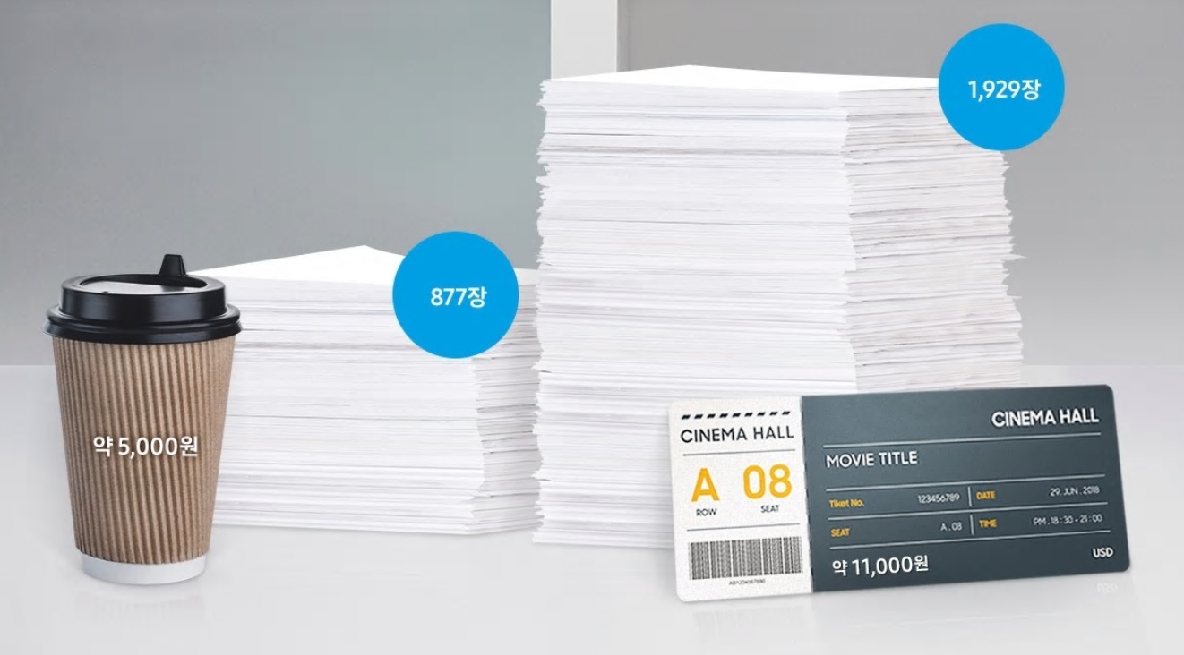 경제적인 출력비용, 커피 한 잔 값이면 하루 한 장씩 2년 4개월 출력 가능, 잉크젯 플러스는 아침에 마시는 커피 한 잔(약 5,000원)만 아끼면 하루 한 장씩 인쇄할 경우 2년 4개월 (총 877장)을 인쇄할 수 있고, 영화 티켓(약 11,000원) 1장 가격이면 5년 4개월(총 1,929장) 동안 가능합니다.